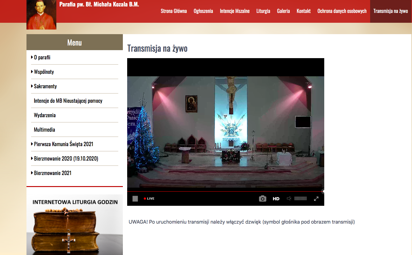 Po rozpoczęciu transmisji na żywo z naszego kościoła, pojawi się na pasku górnego menu zakładka Transmisja na żywo. Należy ją otworzyć: